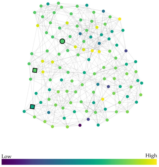 This figure shows one of the tasks from a user study in which participants were shown a node-link diagram along with a colormap legend. Dataset: football; colormap: viridis; node attribute: PageRank. Link to the user study: https://chanhee13p.github.io/colormapInNetworkMode2/.