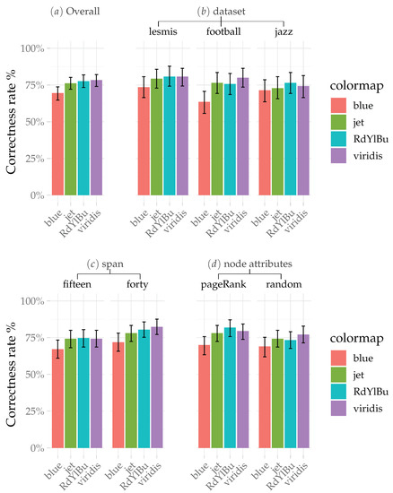 Results of the experiment for the correctness rate. (a) shows the overall correctness rate for each colormap, which is then broken down further into datasets (b), span (c), and node attributes (d).
