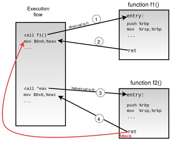 Figure 2 shows a coarse-grained CFI approach where the execution flow consists of direct and indirect control-flow transitions. Both direct and indirect call/ret instructions from 1–4 are valid and verified by coarse CFI. However, the indirect call, call *eax, is a pointer; therefore, besides going to its valid destination function f2(), attackers are also able to divert the flow by illegal jumps to function f1() and initiate a control-flow attack.
