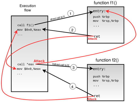 - Checkoway, S.; Davi, L.; Dmitrienko, A.; Sadeghi, A.R.; Shacham, H.; Winandy, M. Return-oriented Programming Without Returns. In Proceedings of the 17th ACM Conference on Computer and Communications Security, Chicago, IL, USA, 4–8 October 2010; pp. 559–572. [Google Scholar] [CrossRef]
