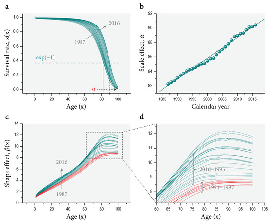 The value, indicating the shape effect of the individual survival curve, was obtained from as shown in Figure 1c. Particularly as demonstrated in Figure 1d, old-age patterns of at ages over 60 years could be empirically fitted with the quadratic formula as as suggested previously [5,12,13]. The modified stretched exponential function is successfully applicable to the survival curves and to the age-dependent stretched exponents for all ages (Figure 1c) and for old ages over 60 years (Figure 1d). Most remarkably, the curve smoothly varies with age at old ages over 60 years and old-age patterns over 90 years can be depicted with the quadratic function of age. As found previously, the patterns for old-age populations undergo the phase transition with age: increases with age at and decreases with age at [12]. The phase transition appears in South Korean female datasets after the calendar year of 1995: there are phase transitions for 1995–2016 and no transitions for 1987–1994, as separately marked in Figure 1d. Considering old-age patterns, the female lifespan of South Korea would experience the critical phase change through the calendar year of 1995. The historic trends in age dependence in clearly show how the female lifespan in South Korea has been growing older during 1987–2016.