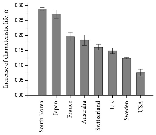 The comparison in the increase rate of for South Korea with that for major industrialized countries is shown in Figure 2. The increase rate in was obtained from Figure 1b for South Korea, 1987–2016 (data from the Korean Statistical Information Service, http://kosis.kr/eng), and from literature [14] for other countries, 1980–2010 (data from the Human Mortality Database, http://www.mortality.org). The error bars were taken from the standard errors by linear fits. The increase rate in per decade was evaluated as ∼2.88 years for South Korea, ∼2.71 years for Japan, ∼1.96 years for France, ∼1.85 years for Australia, ∼1.61 years for Switzerland, ∼1.49 years for UK, ∼1.24 years for Sweden, and ∼0.76 years for USA. This analysis result confirms the highest increase rate of the characteristic life for women in South Korea among the representative high-income countries including Japan, France, Australia, Switzerland, UK, Sweden, and USA.