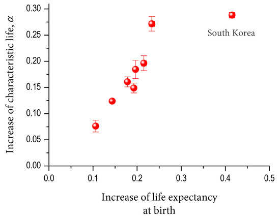 To demonstrate the association of the characteristic life (), taken from Figure 2, with the life expectancy at birth (), the annual increase rates of and are compared in Figure 3. The values for 1980–2015 were taken from the Organization for Economic Cooperation and Development [16] and the increase rates of the values were achieved by linear fits (the error bars taken from the standard errors: some of the error bars are smaller than the symbol sizes). The increase rates of the values per decade were evaluated as ∼4.15 years for South Korea, ∼2.33 years for Japan, ∼2.15 years for France, ∼1.96 years for Australia, ∼1.78 years for Switzerland, ∼1.93 years for UK, ∼1.43 years for Sweden, and ∼1.06 years for USA. The annual increase rate of the values (marked by m) is proportionally correlated with the annual increase rate of the values (marked by n) as (adj. ) except for South Korea. This analysis result suggests that the annual increase rate of the values for South Korea looks an extraordinary case among the representative high-income countries.