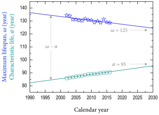 The term lifespan describes how long an individual can live and the (observed) maximum lifespan is the age reached by the longest-lived member of a species, while the life expectancy is a population-based estimate of expected duration of life for individuals at any age, based on a statistical life table [3]. Our methodology enables us to estimate the characteristic life () and the (mathematical) maximum lifespan () as good measures of the human lifespan. The estimates of and for Korean female (data from the Korean Statistical Information Service, http://kosis.kr/eng) are summarized in Figure 4. The estimates of are obtained by the mathematical constraint of [5,14]. The fitting of with the quadratic formula enables us to determine the estimates of at the specific age of which corresponds to the intercept point [5]. This estimation is practically available if and only if the phase transition exists in old-age curves. Indeed, the estimates of are significant over the calendar year of 2002, as shown in Figure 4.