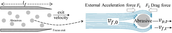 where is the fluid flow rate; is the abrasive flow rate; and and are the velocities of the fluid and particle at time (t). If the acceleration is sufficient to make the velocity of the abrasive equal to that of the fluid, the slurry velocity becomes the terminal velocity (). The slurry comprising the abrasive particles and water passes through the focus, and the energy efficiency is reduced according to the focus geometry and mixing efficiency. Thus, the terminal velocity becomes
