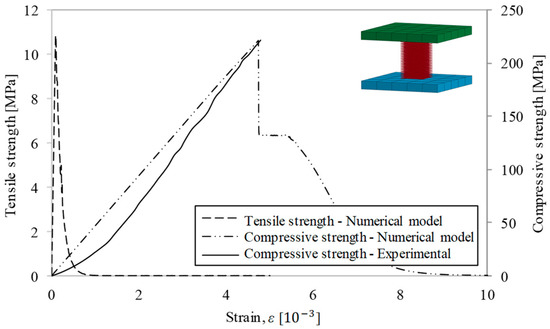 Numerical analyses were conducted for the same cases as those in the theoretical tests (Table 2). LS-DYNA provides many material models for concrete, rock, and soil, including Brittle Damage, Johnson–Holmquist concrete, Concrete Damage Rel3, and Continuous Surface Cap Model (CSCM). To simulate plastic deformation and microcrack failure of the target simultaneously, CSCM was used as the damage model. In CSCM, crack failure occurs via brittle damage when the energy exceeds the threshold, due to tensile pressure [46]. This model is suitable for high-stress, large-strain conditions such as those present in crater formations, concrete spalling, and impact-induced fracture inside concrete [47]. Therefore, microcrack generation using a conical pick in rock [48], the unloading characteristics of rock [49], and the smeared crack approach for concrete damage progression under repeated impact [50,51] have been simulated using the CSCM. The properties of the target were measured and computationally modeled via numerical analysis (unconfined compressive strength: 236 MPa; tensile strength: 11 MPa; Young’s modulus: 56.5 GPa; Vickers hardness: 980 kg/) (Figure 5 and Table 3). As the CSCM has many input parameters, the properties of the rock-like target were repeatedly adjusted and combined to obtain the same properties as those of the actual granitic rock specimen. To prevent breakage of the abrasive particles upon collision, an elastic model was used for modeling the abrasive particles.