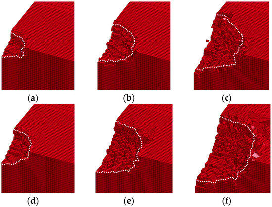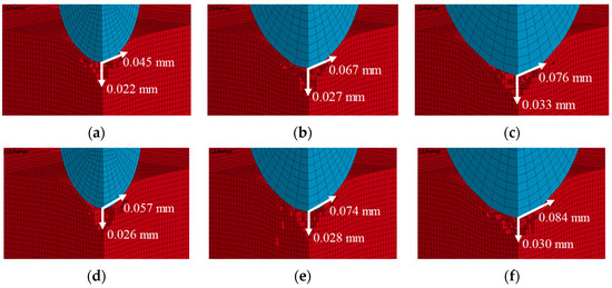 Target sinking due to plastic deformation was evident (Figure 7), and microcracks appeared immediately. This finding was the same as that in previous studies, where the rock began to sink at first and experienced compression and breakage upon collision [43,51,52]. In the analysis results corresponding to abrasive diameters of 0.18 mm and 0.264 mm, half-penny-shaped microcracks were evident after plastic sink deformation, and lateral-shaped microcracks were observed when the abrasive diameter was 0.344 mm (Figure 7c,f). The numerically obtained erosion depths due to indentation by each abrasive particle are shown in Figure 8, and the erosion depth increased with an increasing density and diameter of the abrasive particles.