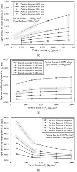 As the density of the abrasive increased, the erosion depth increased, but the magnitude of the density effect decreased gradually as the density increased. The larger the diameter of the abrasive particle was, the greater the density effect was (Figure 11a). In addition, the greater the hardness of the abrasive particle was, the greater the erosion depth was; however this effect was not significant for small particle diameters (Figure 11b). As the hardness of the target increased, the erosion depth decreased. The larger the particle diameter was, the greater the effect of the target hardness was. The smaller the target hardness was, the larger the reduction in the particle diameter effect was, eventually leading to convergence (Figure 11c,d). The comprehensive erosion characteristics are presented in Figure 12.