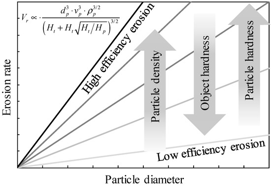 As it provides a simple expression for energy conversion into work during erosion, this model is called the simple energy–work erosion model. This model considers the effective erosion kinetic energy and relative hardness and proves that increasing the particle hardness increases the removal rate. This finding is similar to that of previous experimental and theoretical studies [41,42].