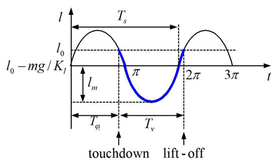 As illustrated in Figure 2, the thick line segment represents the time-amplitude curve of the linear spring leg in stance phase of a motion cycle. Suppose the length of the leg at the instants of touchdown and lift off is the nature length , the duration of stance phase is , the initial phase-angle of the harmonic vibration of the leg is , and the vibration amplitude of the spring leg is , then the oscillations of the linear leg in stance phases can be approximately expressed by