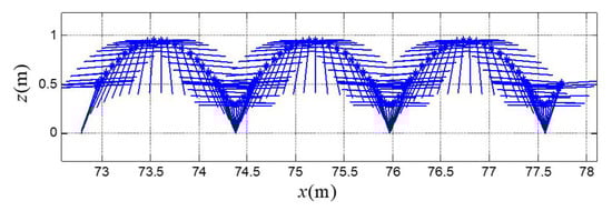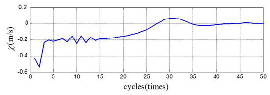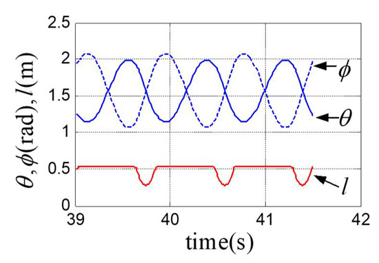 Figure 4 shows the trajectories of the variables in the last three cycles of fifty hops in total, Figure 5 illustrates the corresponding control inputs, and Figure 6 plots the animations of the robot in the last three hops. The state jumps measure Equation (60) of the controlled robot system is illustrated in Figure 7, which shows that the state jumps at touchdown phase finally converge to zero. In other words, the hopping robot is stabilized to a periodic orbit with zero impulse at touchdown phases, so that the energy efficiency of the hopping system is improved and the maximum of the inputs is reduced to a reasonable level (referring to Figure 5); otherwise, the maximum of the inputs will be very large under closed-loop mode. However, the nonzero inputs of the robot in stable hops are caused by the approximate target trajectory Equation (64) since the spring leg in stance phase is actually an oscillating system with variant stiffness. Referring to Equation (52), the actual equivalent stiffness of the linear spring leg should be . In addition, as examples, Figure 8 and Figure 9 also respectively show that the state variables and are stabilized to a period one orbit.