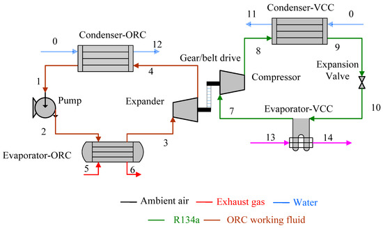 Schematic of proposed organic Rankine cycle-vapour compression cycle (ORC-VCC) systems for waste heat recovery.