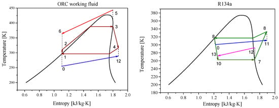 A program developed on the basis of the MATLAB platform was adopted to analyse the thermodynamic performance. Four environmentally friendly working fluids—R1233zd, R1234zez, R245fa and R245ca—were considered as the ORC working fluids for the performance comparison, and the refrigerant R134a was used in the VCC. Their enthalpies and entropies of were obtained by using a database Refprop 9.0.