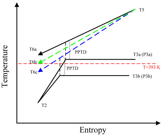 Figure 4 shows the evaporation process based on the PPTD method, which has been explained in our previous study [35]. During the evaporation process, the evaporation temperature of working fluid rises as the pressure increases. For a working fluid with higher critical temperature, when ORC operates at T3a, the relative exhaust gas temperature T6a after heat transfer is above 393 K. In this case, the heat transferred in the evaporator will become smaller as the evaporation pressure increases, which would lead to a reduction of power output.