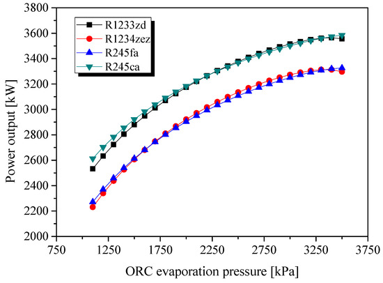 Effects of ORC evaporation pressure on ORC power output for different working fluids.