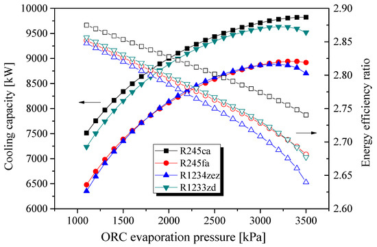 Effect of ORC evaporation pressure on cooling capacity and energy efficiency ratio for different working fluids.