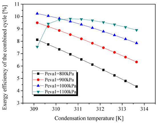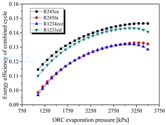 Figure 7 shows the variation of exergy efficiency when the ORC is operated under different evaporation pressures. In this system, the exergy output refers to the cooling exergy of the evaporator in the VCC, and the exergy input consists of the heat exergy of the evaporator in the ORC and the pump power. At the same evaporation temperature, the variation trend of exergy efficiency in Figure 6 is similar to that of the cooling capacity. This is because the exergy output of cooling is linearly correlated to the cooling capacity at a given VCC evaporation temperature. Furthermore, a higher ORC evaporation pressure leads to a better temperature match between the organic working fluid and the exhaust gas, and the exergy destruction per mass unit decreases.