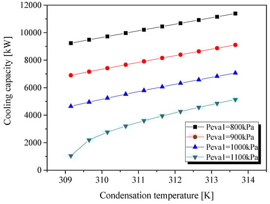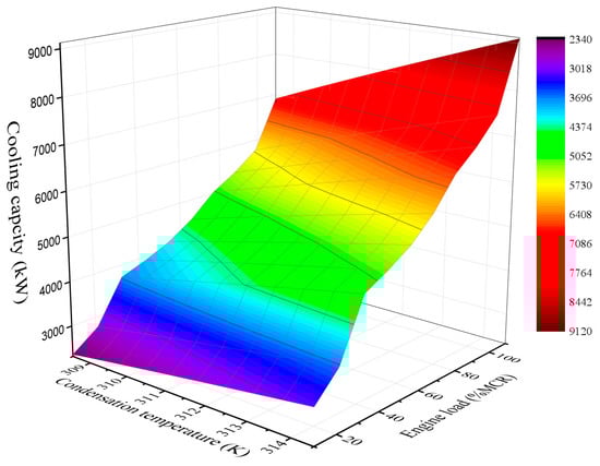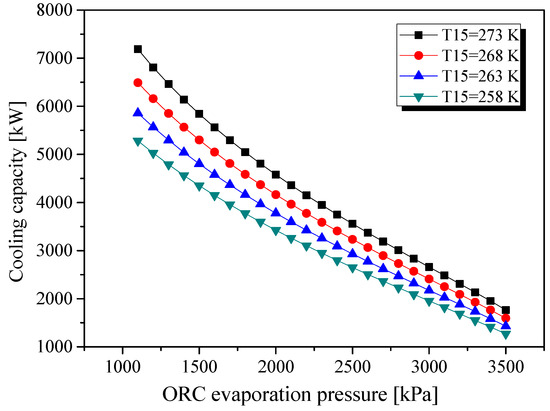 Figure 14 also shows that the cooling capacity increased with the condensation temperature. However, the condensation temperature is limited by the parameters of sea water, including its temperature and flow rate. The operational condition of the combined cycle could be controlled by adjusting the ORC operation pressure and the flow rate of the heat sink and heat sources according to the cooling demand on ship.