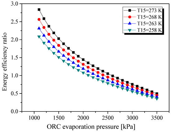 The calculated EER of cooling strongly depends on the operating conditions, especially absolute temperature and the temperature difference between the heat sink and the target refrigeration temperature. Figure 9 illustrates that the EER of cooling decreases with ORC evaporation pressure. For a given heat sink temperature, the VCC condensation pressure and temperature rise when the ORC evaporation pressure is increased. In that case, the temperature lift of the refrigerant between the condenser and the evaporator is enhanced, resulting in a decreased EER.