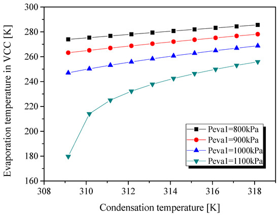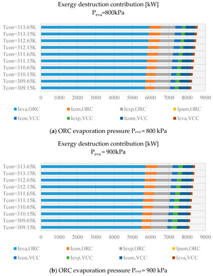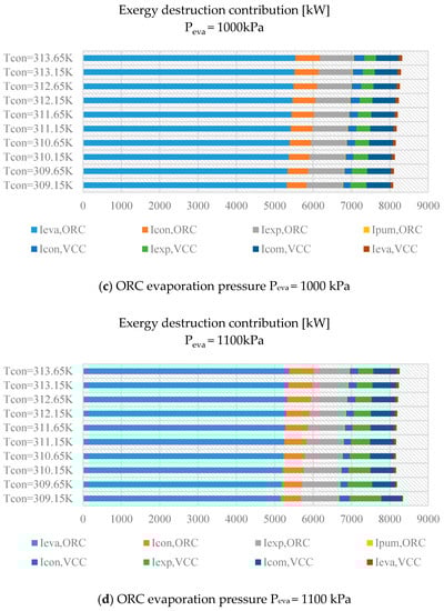 In the VCC subsystem, the irreversibility across the compressor is the maximum under most working conditions. However, the exergy destruction in the compressor is higher than that when the condensation temperature is lower than 309.65 K and Peva = 1100 kPa. This suggests that in order to improve the performance of the proposed system, special attention should be paid to reducing the irreversibility that exists in these components during machine design.