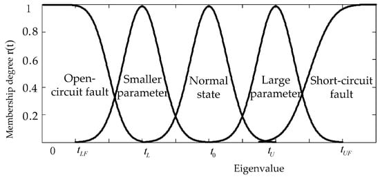, , , , and are membership degrees of test indicators subjected to open-circuit fault, fault induced by smaller parameters, normal state, fault induced by large parameter, and short-circuit fault.