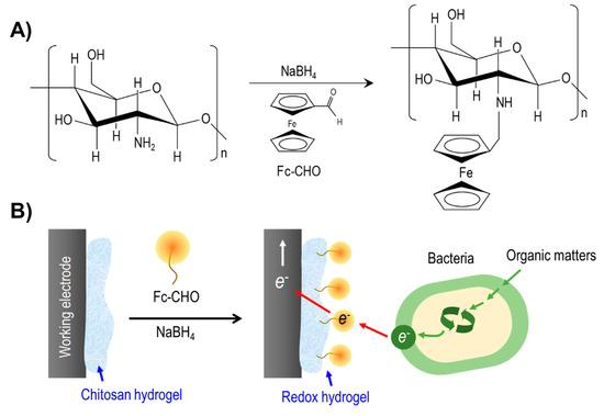 Carbon cloth and a proton-exchange membrane were purchased from Fuel Cell Store (College Station, TX, USA). Chitosan (Mw 50–190 kDa) and ferrocenecarboxaldehyde (C11H10FeO) were obtained from Sigma Aldrich (St. Louis, MO, USA). All supplementary chemicals were of analytical grade and used without further purification. All solutions were prepared with 18.2 MΩ cm Milli-Q water (Millipore, St. Louis, MO, USA).