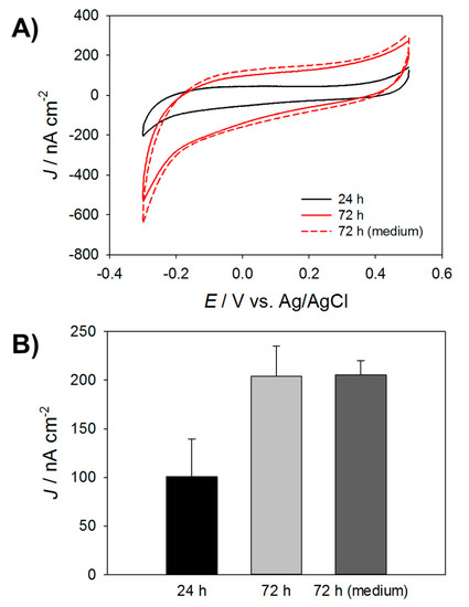 After C. glutamicum cells were inoculated into a reactor containing a glassy carbon electrode, cyclic voltammograms were analyzed. As shown in Figure 2A, both the anodic (oxidation) and cathodic (reduction) currents after 72 h of bacterial growth (red) were highly increased relative to 24 h (black). The cyclic voltammogram, after removing bacterial cells (cell-free medium) after 72 h growth, still maintained its original capacitance (dashed red). Different cyclic voltammetry patterns were also measured at abiotic (medium only) and biotic condition (with bacteria) (Figure S1). Chronoamperometry data (Figure S2) and the mean current densities (Figure 2B) after 72 h growth with or without bacterial cells (cell-free medium) and poised at +0.4 V (vs. Ag/AgCl) were measured to ca. 205.5 ± 14.7 nA cm−2 (n = 3). The results reflect the electrical interaction between the bacteria and the electrode through the extracellular components.