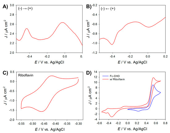 Differential pulse voltammetry (DPV) graphs (A) from negative to positive potentials (oxidation) and (B) from positive to negative potentials (reduction) of glassy carbon electrodes in cell-free medium after 72 h C. glutamicum growth. (C) Cyclic voltammogram of riboflavin (2 µM) and (D) ferrocenecarboxaldehyde (Fc-CHO, 100 µg mL−1) in 0.1 M sodium phosphate buffer (pH 7.0). Scan rate, 10 mV s−1.