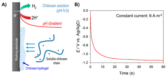 (A) Electrodeposition of chitosan hydrogel. (B) Chronopotentiometry data for chitosan hydrogel formation on carbon cloth anode.