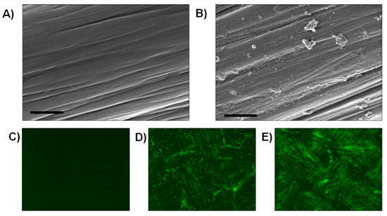 SEM images of (A) bare carbon cloth and (B) chitosan-hydrogel-coated carbon cloth. Scale bar, 1 µm. Fluorescence microscopic images of (C) chitosan-hydrogel-coated carbon cloth without bacteria, (D) chitosan-hydrogel-coated carbon cloth which were incubated with C. glutamicum for 24 h and (E) 72 h. Attached bacteria were stained with SYTO9 dye (5× magnification).