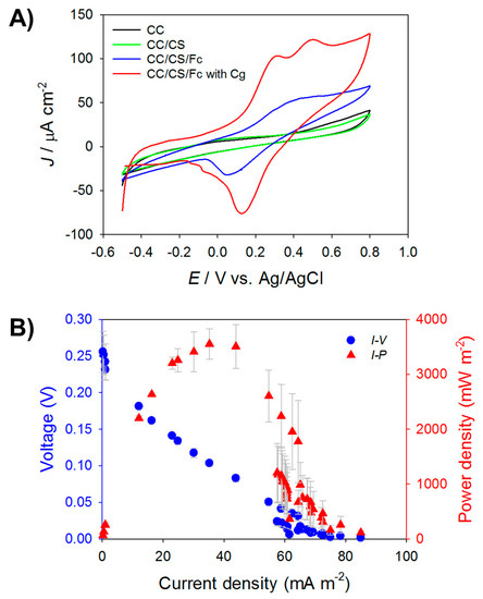 (A) Cyclic voltammograms of redox-hydrogel-modified electrode. CC, bare carbon cloth electrode; CC/CS, chitosan hydrogel modified electrode; CC/CS/Fc, ferrocene-branched chitosan redox-hydrogel modified electrodes, and Cg, C. glutamicum. Scan rate, 10 mV s−1. (B) Voltage and power density measurements as function of applied current for device. Circle symbols (blue), current-voltage (I-V) curve. Triangle symbols, current-power density (I-P) curve.