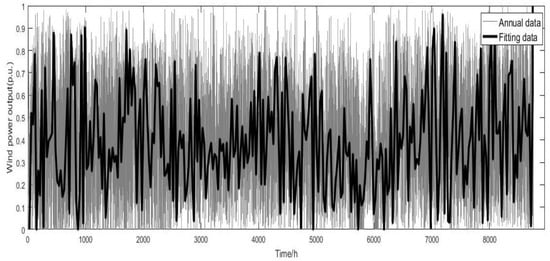 - Random. As shown in Figure 1, the fitting curve of the annual wind power output curve can be clearly observed. For the hourly statistics of wind power output, the output at each moment shows obvious uncertainty.