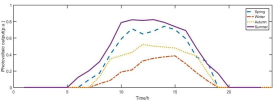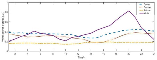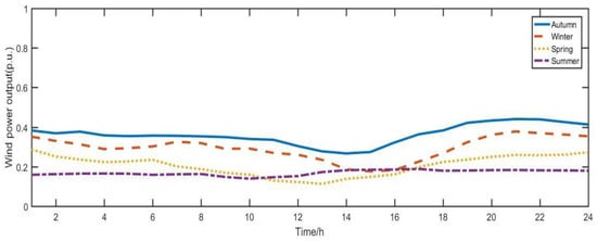 - Seasonal variation characteristics. As shown in Figure 2, wind power output has a certain seasonal variation characteristic. Wind power output is relatively large in autumn and relatively small in summer, and the difference is relatively obvious. At the same time, the output curve of each season is quite different from the typical solar output curve, and the typical solar output curve cannot reflect well the characteristics of the output variation in each season.