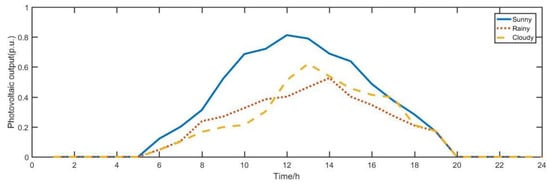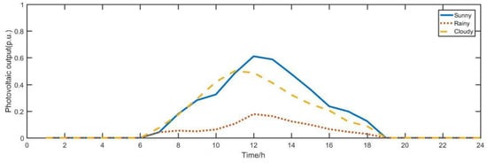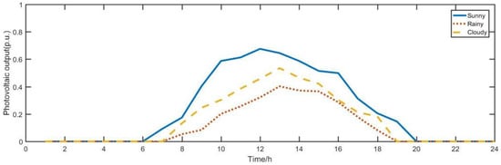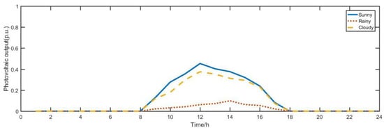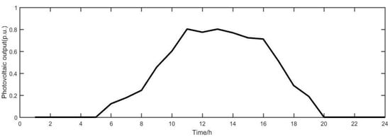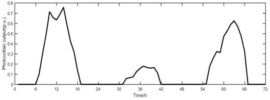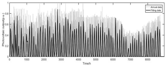 According to the uncertain modeling results of illumination intensity in the previous section, the corresponding photovoltaic output curve can be obtained. Illumination intensity data can be obtained from the Data Sharing Center of the National Meteorological Administration of China. Figure 5 is the annual photovoltaic output variation curve and its fitting curve of a region. Figure 6 is the photovoltaic output curve of different seasons. Figure 7 is the continuous multi-day photovoltaic output variation curve. Figure 8 is the typical solar output variation curve.