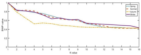 In this paper, wind power generation scenarios are taken as an example to verify the effectiveness of the reduced scenarios. According to the four seasons of spring, summer, autumn and winter, all scenes are divided. The improved clustering algorithm proposed in this paper is used to reduce the partitioned scenes, and the BWP value of clustering results is calculated to select the optimal result. Figure 10 shows the change curve of BWP value with k value after clustering.