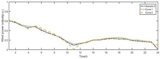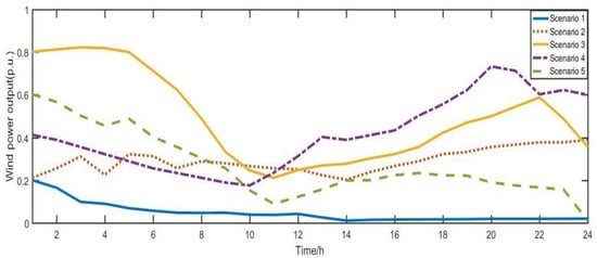 According to the change curve of BWP value, the BWP value is the largest in spring, autumn and winter scenarios when k = 2, and in summer, when k = 3, the BWP value is the largest. But in order to reflect the temporal characteristics of the original scene to the greatest extent, this paper chooses the case where the k value is relatively large and the number of scenes is relatively large. Taking spring as an example, when k = 2 and k = 5, the k value is larger. Choosing k = 5 here, the scenarios to be reduced are divided into five categories. The output curves of these five scenarios are given below, as shown in Figure 11.