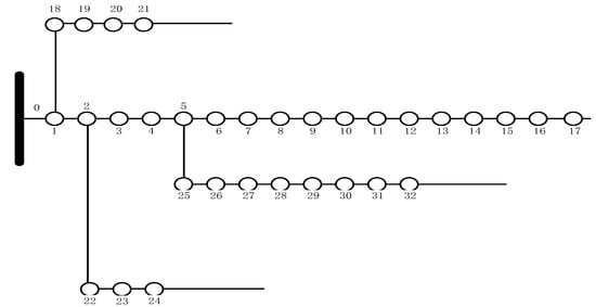 The proposal is verified on using the IEEE33 node system which is shown in Figure 19 (Figure 19). The system voltage is 12.66 kV, total active load is 3.715 MW, total reactive load is 2.300 MW, Weibull distribution parameter k = 2.30, C = 8.92, wind power access cost 6500 yuan/kW, operation and maintenance cost 0.3 yuan/kWh, environmental protection subsidy 0.1 yuan/kWh, rated lighting intensity of photovoltaic generator is 1 kW/m2, shape parameter B of beta distribution is 0.85, photovoltaic access The cost is 10,000 yuan/kW, the operation and maintenance cost is 0.2 yuan/kWh, the rated capacity of a single distributed power supply is 125 kW, the equipment life is 20 years, and the discount rate is 0.1. The repair time of N-1 fault is 4 h, and the comprehensive safety index value is set to 0.5. Wind power installation nodes are 5, 7, 11, 12. The photovoltaic installation nodes are 20 and 23.