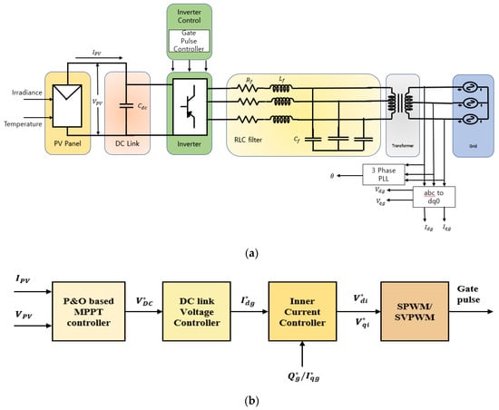 Single-stage three-phase grid-connected photovoltaic (PV) system: (a) overall system; (b) inside inverter control block.