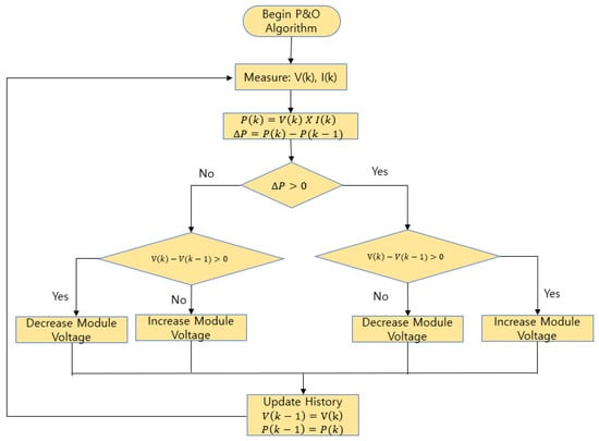 In P&O technique [12] the tracker operates by periodically increasing or decreasing the voltage. The controller changes the reference voltage for the DC link voltage controller by tracking and comparing the present and one-step-behind power and voltage values. The increasing or decreasing of the reference value is applied with a fixed small value. The flowchart of a perturbation and observation-based algorithm is given below in Figure 3.