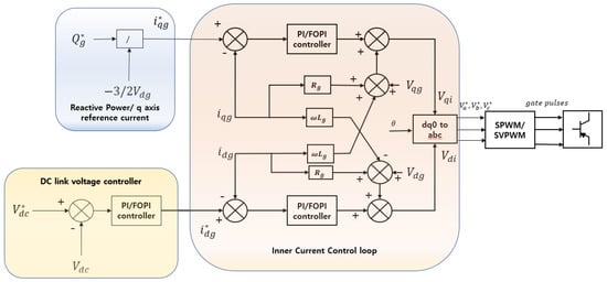 Figure 4 represents the outer voltage and inner current control loops, where, and are the reference voltage fed from MPPT controller and measured DC link voltage, respectively. is the reference reactive power. and are the reference d- and q-axis current components of grid current, respectively. and are the measured d- and q-axis current components of grid current, respectively. and are d- and q-axis components of grid voltage.
