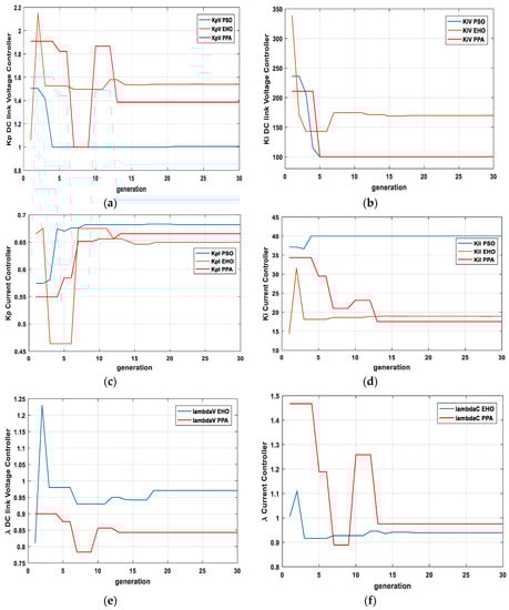 Gain parameters’ trajectory with respect to generation: (a) Kp gain of DC link voltage controller; (b) Ki gain of DC link voltage controller; (c) Kp gain of d- and q-axis current controller; (d) Ki gain of d- and q-axis current controller; (e) of DC link voltage controller; (f) of current controller.