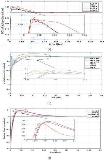 The optimal response of the DC link voltage controller, d-axis current and reactive power/q-axis current control loop is given in Figure 11. Optimization was done under the maximum irradiance of 1000 w/m2 and a fixed temperature of 25 °C. In Figure 11b, unlike Figure 11a,c, there are different individual reference values for each of the optimization algorithms. This is because the reference value for the d-axis current controller comes from the output of the DC link voltage controller. As responses from different optimization techniques provide different outputs from the DC link voltage controller, the reference value also changes for the d-axis current controller.
