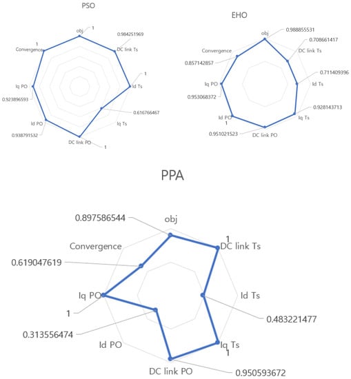 From Table 5, in terms of objective function, PPA shows a better result over PSO and EHO. However, at the molecular level (settling time and peak overshoot) the performance can be varied. For example, settling time for DC link voltage controller and Iq/Q controller in terms of PPA is greater than PSO and EHO. Also, peak overshoot of Iq/Q for PPA-based controller is greater than PSO- and EHO-based controllers. Hence, it is difficult to say that PPA is better than EHO and PSO from the tabular analysis only. So, a spider graph-based [19] approach is proposed to compare the indexes to find out the best algorithm.
