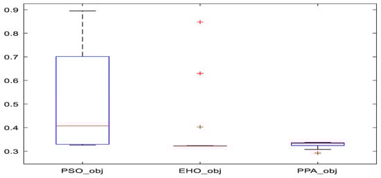The boxplot in Figure 13. represents the fitness function values corresponding to the population at the final iteration (generation). The fitness functions for EHO and PPA are distributed over a narrow range, except for a few far points (red + markers) for EHO. Also, the means for PPA and EHO are much less than for PSO. The lowest value of the objective function is found using the PPA-based algorithm which validates the result from Figure 9. The smaller range of objective function signifies that all the population has reached the global optimal solution.