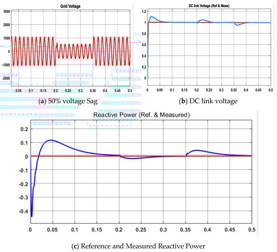 The performance of the proposed controllers was also tested under voltage sag condition. With a symmetrical voltage sag of 50% with 0.15 s duration, the controllers were still able to reach the steady-state comfortably. The sudden rises in responses at 0.2 and 0.35 s from Figure 16b,c represent the changes in voltage level.