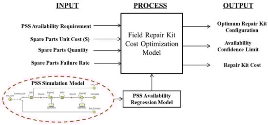 For the next step of the process, the PSS availability regression model created from the previous step is embedded into the field repair kit cost optimization model. The IPO diagram for the optimization model is shown in Figure 3.
