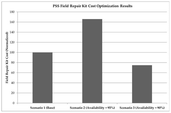 Figure 4 shows, for each scenario, the total of the cost of the PSS field repair kit. The results show that in order to meet the PSS availability requirement of 95%, the total cost of the field repair kit must increase by more than 60% over that of the originally proposed field repair kit composition in Scenario 1. However, when the PSS availability requirement constraint is relaxed to 90%, the cost of the field repair kit was significantly reduced, nearly down to 50% of the field repair kit cost shown in Scenario 2. In other words, increasing the availability requirement by 5% resulted in a 50% increase in the total cost of the field repair kit. Additionally, it is observed that if 90% PSS availability is acceptable to the customer, the optimized field repair kit can be composed for lesser cost than the original field repair kit proposed by the design team.