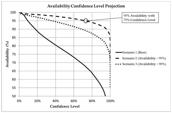 In the figure, the topmost curve shows the confidence level of the PSS with the field repair kit optimized for 95% availability. The specific data point singled out shows that this particular PSS with the optimized field repair kit can meet the 95% availability requirement with a 75% confidence level. The second curve shows the confidence level of the PSS with field repair kit optimized for 90% availability. It shows a 70% confidence level for meeting the 90% availability target. Finally, the two optimized field repair kits, in contrast with the original field repair kit in the base scenario, performed particularly well in terms of expected confidence level to meet the PSS availability requirements. Results obtained and shown in Figure 4 and Figure 5 and Table 5 can be a valuable guideline for assessing the PSS availability with a specific field repair kit. Cost savings realized by the adjustment of the field repair kit inventory should be balanced against the expected PSS confidence level for meeting availability requirement promised to customers. The company can also create a mitigation plan based on the confidence level to minimize the risk of not meeting the availability requirement.