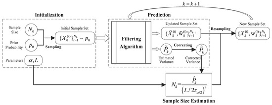 The adaptive particle filter with KL-sampling proposed by Dieter [43] limits the estimation error through adaptive changes of sample size, but it may bring high computational cost [44,45]. Torma et al. [46] proposed a particle filter based on an adaptive adjustment of likelihood distribution, whereas the weight variance of particles has a great influence on the sample size [47]. In Section 3, we will introduce an adaptive strategy based on the relationship between state variances and sample size, which is derived by introducing theories in Probability & Statistics.