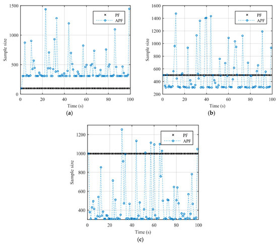 For the algorithms based on PF with fixed sample size, the invariant sample size directly affects the computational complexity, making the real-time and accuracy of these algorithms worse [5]. To find out the relationship between accuracy and the number of samples, is defined as the state space, and the target motion model shown in Equation (2) is rewritten as the general form of the nonlinear system state equation [50],
